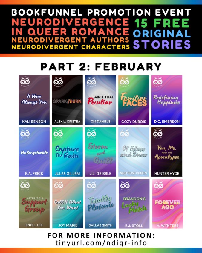 I’m excited for you to read my Neurodivergence in Queer Romance novella: Unforgettable! I joined with dozens of queer, neurodivergent authors of romance to write representation reflecting us, all for free!