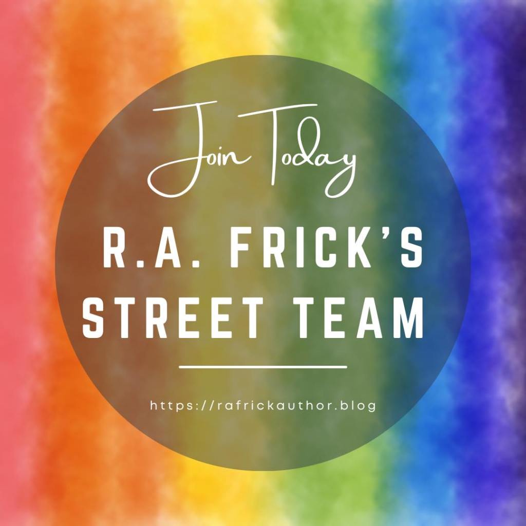 R.A. Frick’s Street Team is a source of support, made up of their biggest cheerleaders and their closest fans. Joining this elite group will mean early access to RA’s books, exclusive giveaways, and whatever else we can come up with.