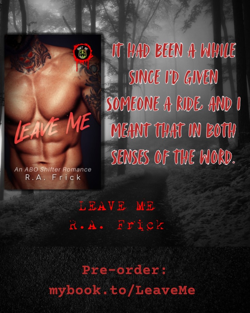 Leave Me is the first book of the Shift MC series about a motorcycle club of wolf shifters set in the woods of Northern California, with ABO shifters and a small town of LGBTQIA+ characters. There is heat and fated mates, but no mpreg (on page).